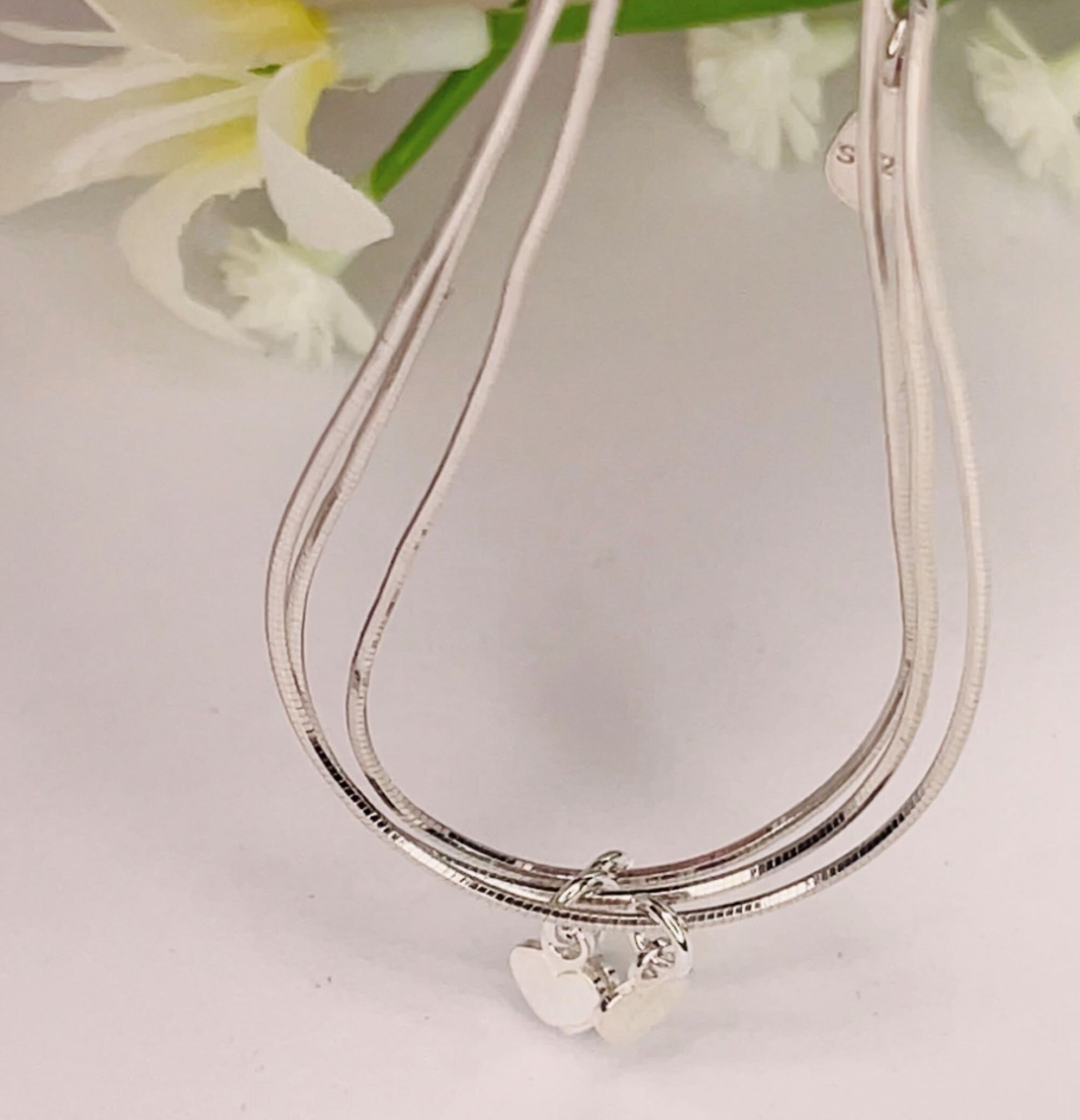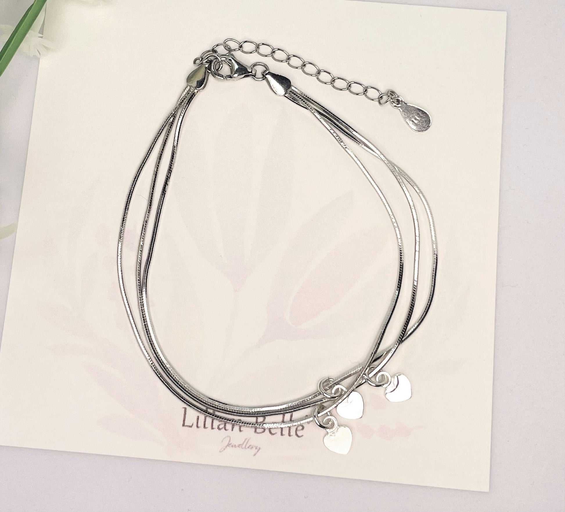 This dainty sterling silver rhodium plated three strand bracelet is the perfect simple bracelet for everyday wear or makes the perfect gift. Each strand of the bracelet has a little 4mm sterling silver heart attached which dance around and catch the light.